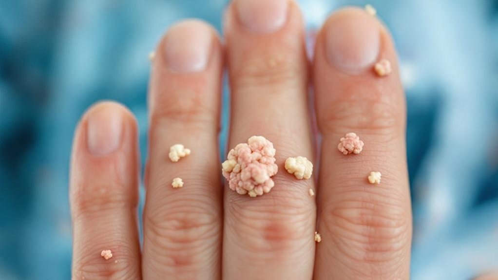 Warts are common skin growths caused by human papillomavirus (HPV), appearing as rough-textured bumps on the skin. We classify them as common, plantar, flat, or filiform, depending on their location and appearance. They’re transmitted through direct contact or contaminated surfaces, with children and immunocompromised individuals at higher risk. Treatment options range from over-the-counter salicylic acid to professional cryotherapy or laser removal. Understanding your specific wart type guides ideal treatment selection.