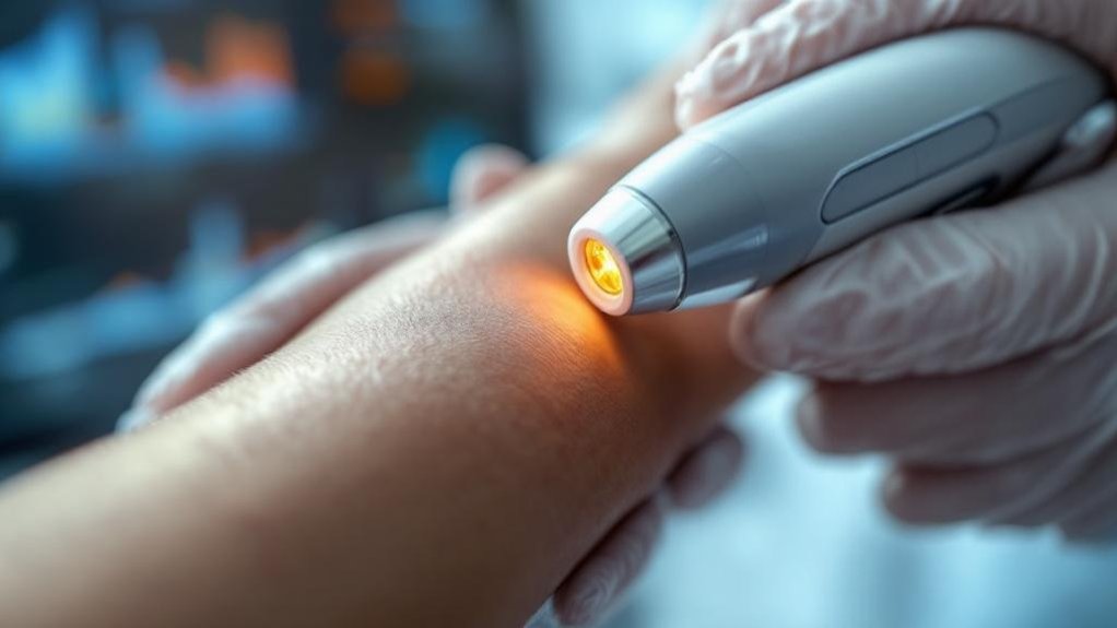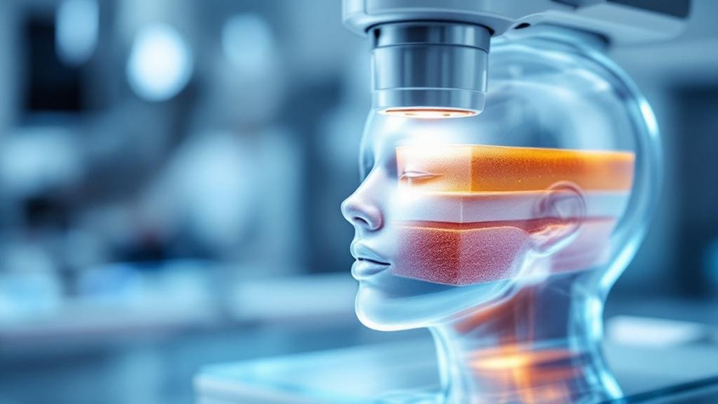 When treating skin cancer with radiation therapy, understanding the specific penetration characteristics of various modalities becomes crucial for ideal outcomes. At our practice, we carefully select radiation types based on the lesion’s depth and location. Superficial radiation therapy utilizes low-energy kilovoltage X-rays (50-150 kVp) that penetrate only 2-7 millimeters into skin tissue—precisely where basal and squamous cell carcinomas develop. This targeted approach is essential since it allows for precise tumor imaging while delivering controlled radiation doses. Unlike high-energy megavoltage systems that target deeper tissues, our approach concentrates radiation exactly where it’s needed. We make dosage adjustments according to anatomical variations, lesion size, and patient-specific factors. This precision guarantees maximum therapeutic effect while sparing underlying healthy structures like blood vessels, fat, and nerves. Our team’s expertise in radiation penetration physics allows us to deliver treatments that effectively eliminate cancer cells while preserving your skin’s cosmetic appearance. These specialized techniques achieve success rates of 84-99% for basal and squamous cell carcinomas, providing patients with highly effective non-surgical treatment options.