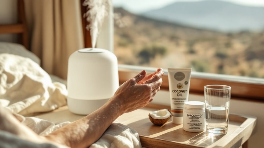 To manage eczema in California’s dry climate, we’ll need to focus on protecting our skin barrier through consistent moisturizing and environmental control. We should apply ceramide-rich moisturizers to damp skin twice daily, maintain indoor humidity levels between 30-50%, and use HEPA filters to reduce allergen exposure. Wearing breathable fabrics and staying hydrated are essential, while keeping temperatures between 68-72°F helps prevent flare-ups. The following strategies offer a complete defense against California’s challenging climate conditions.